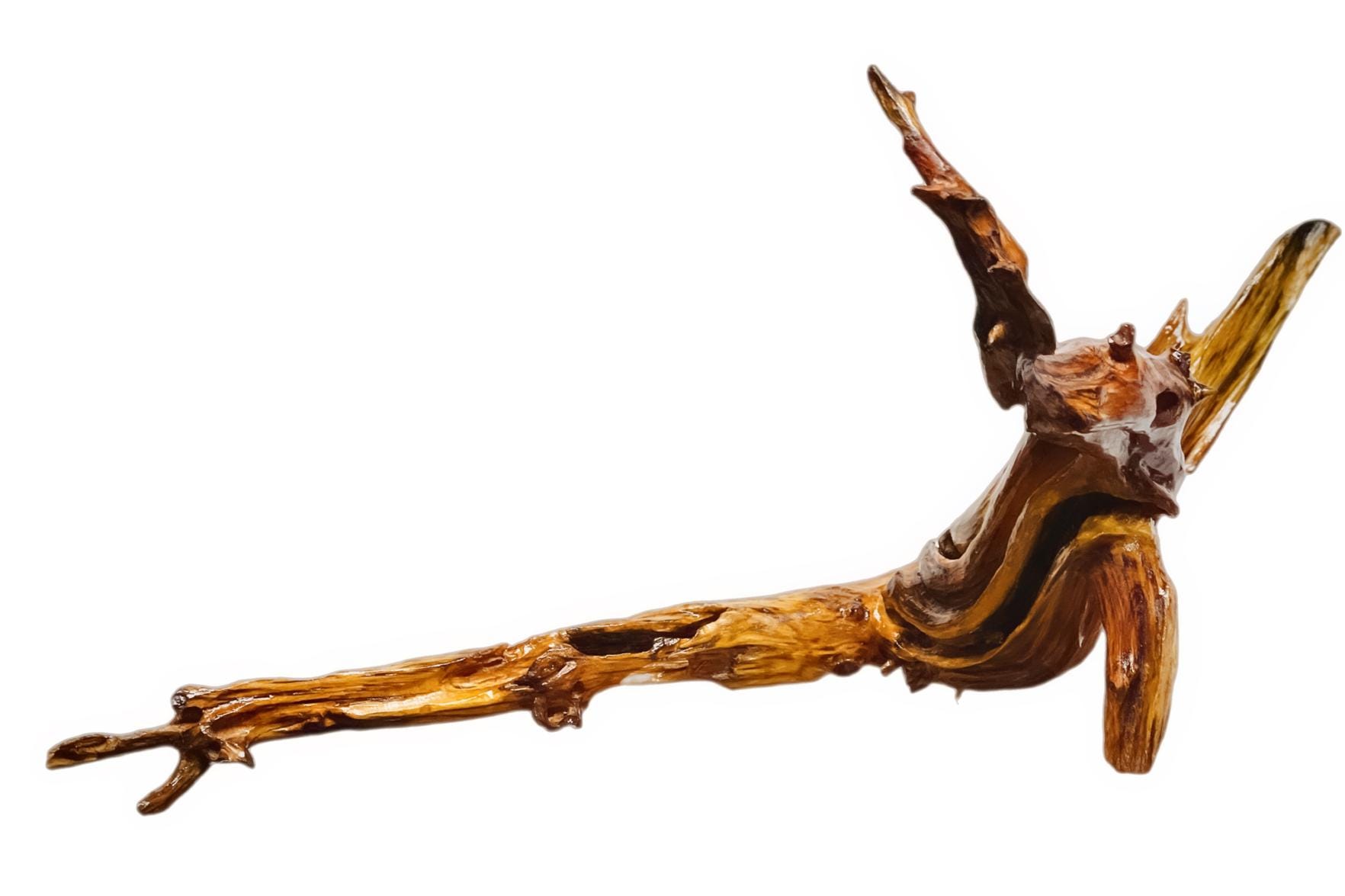 Each curve and contour was revealed naturally as I shaped the wood with rotary tools — I never quite know what will emerge. Parts of the aged cedar give way, uncovering layers of red, violet, and pale gold grain beneath. After carefully sanding the figure, I finished it with a light stain to enhance the color and a protective polyurethane coating to preserve its beauty for years to come — no re-oiling needed.