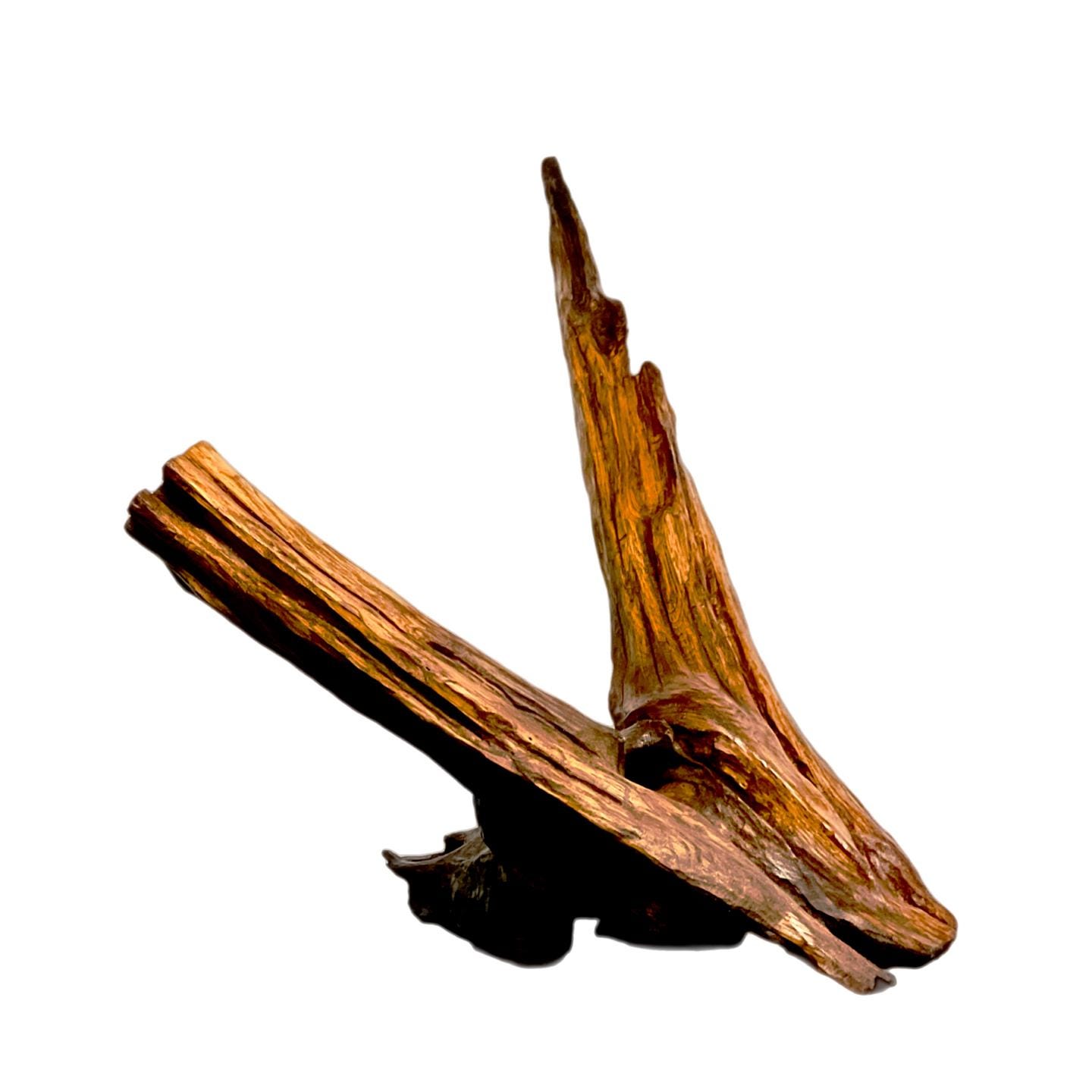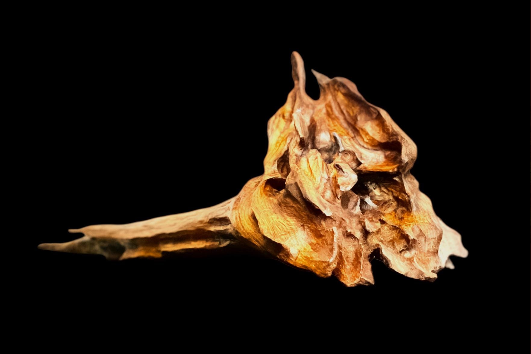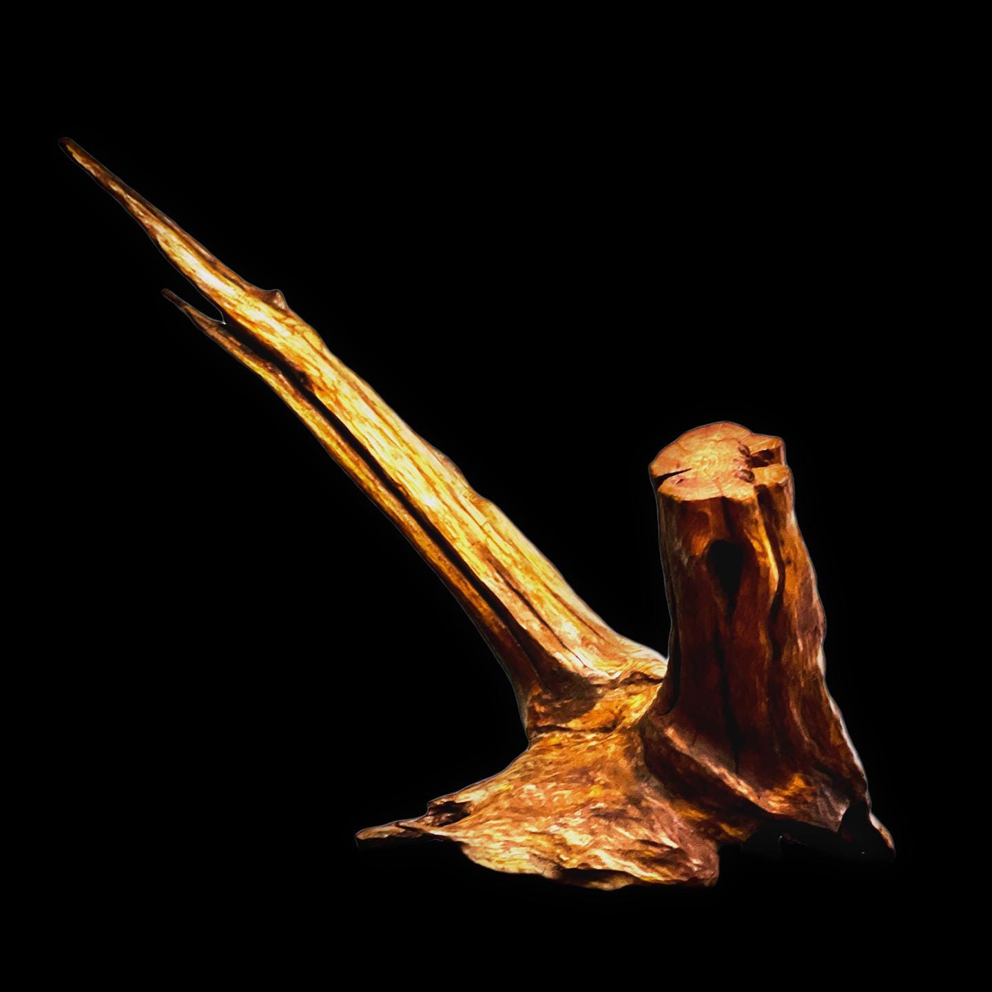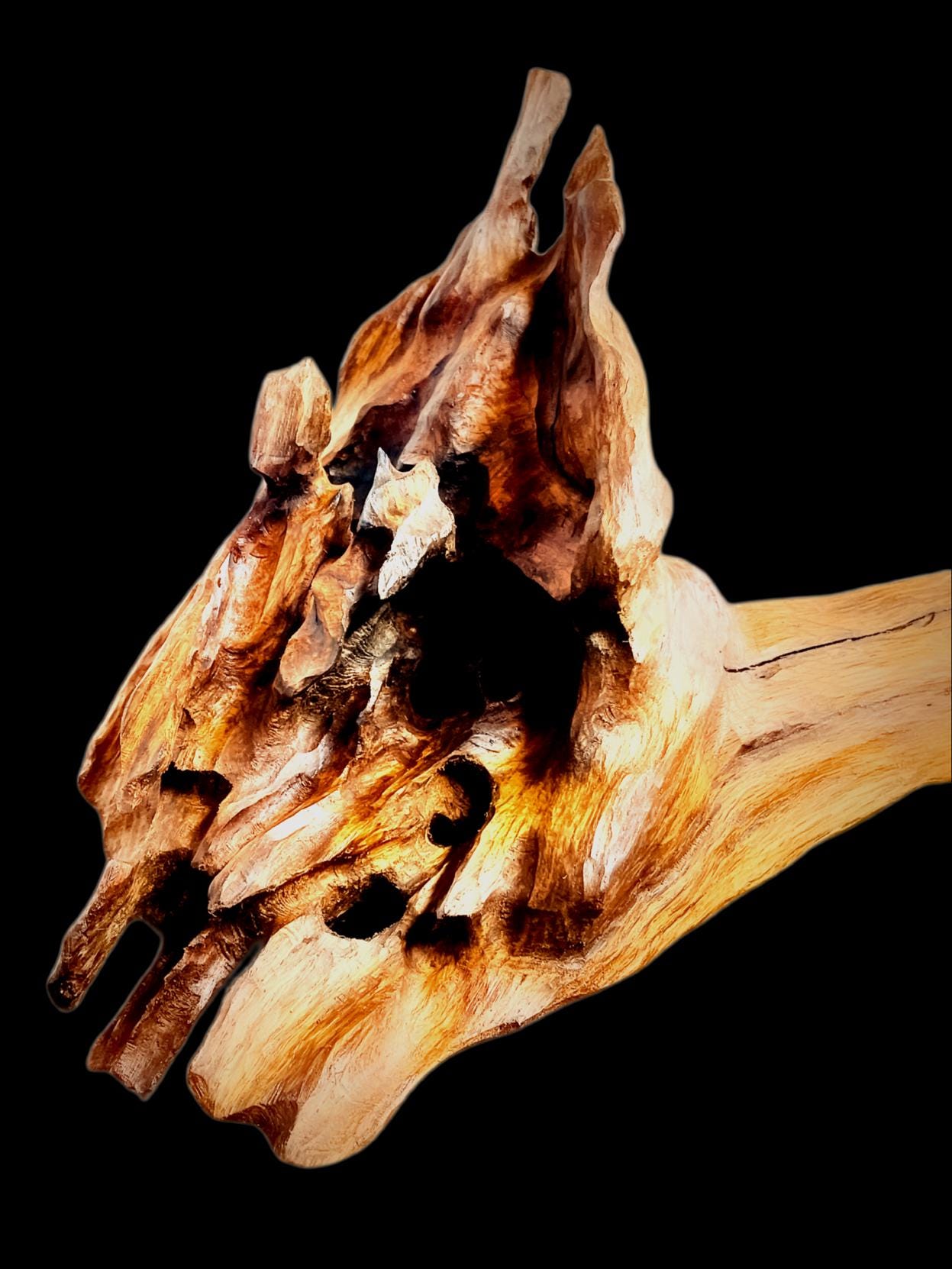 This striking sculpture is carved from a solid piece of wood (species unknown) and finished with a light stain and matte polyurethane for a soft, natural look. It’s a bold and organic statement piece that suits any home decor—from rustic to modern minimalist.