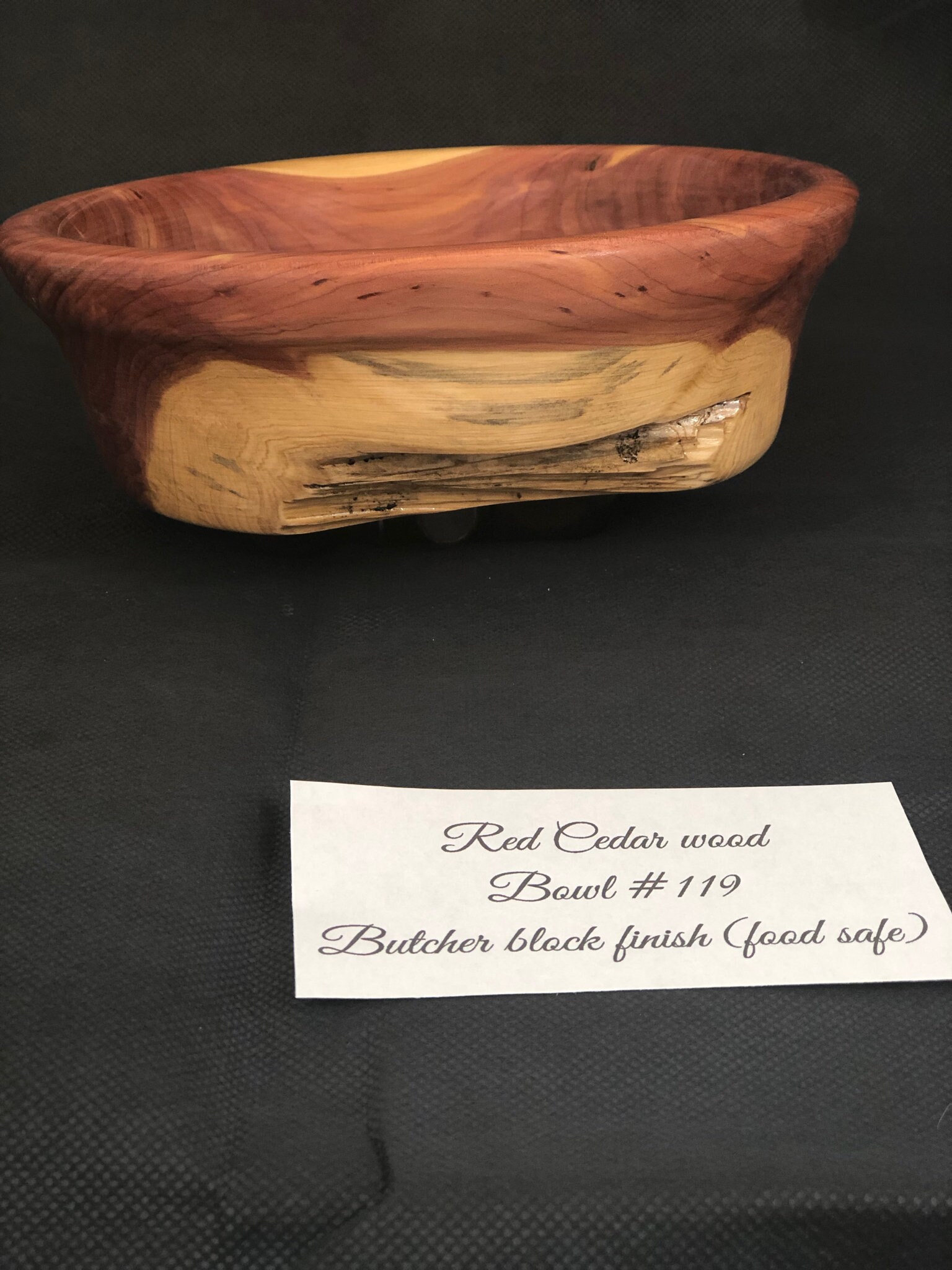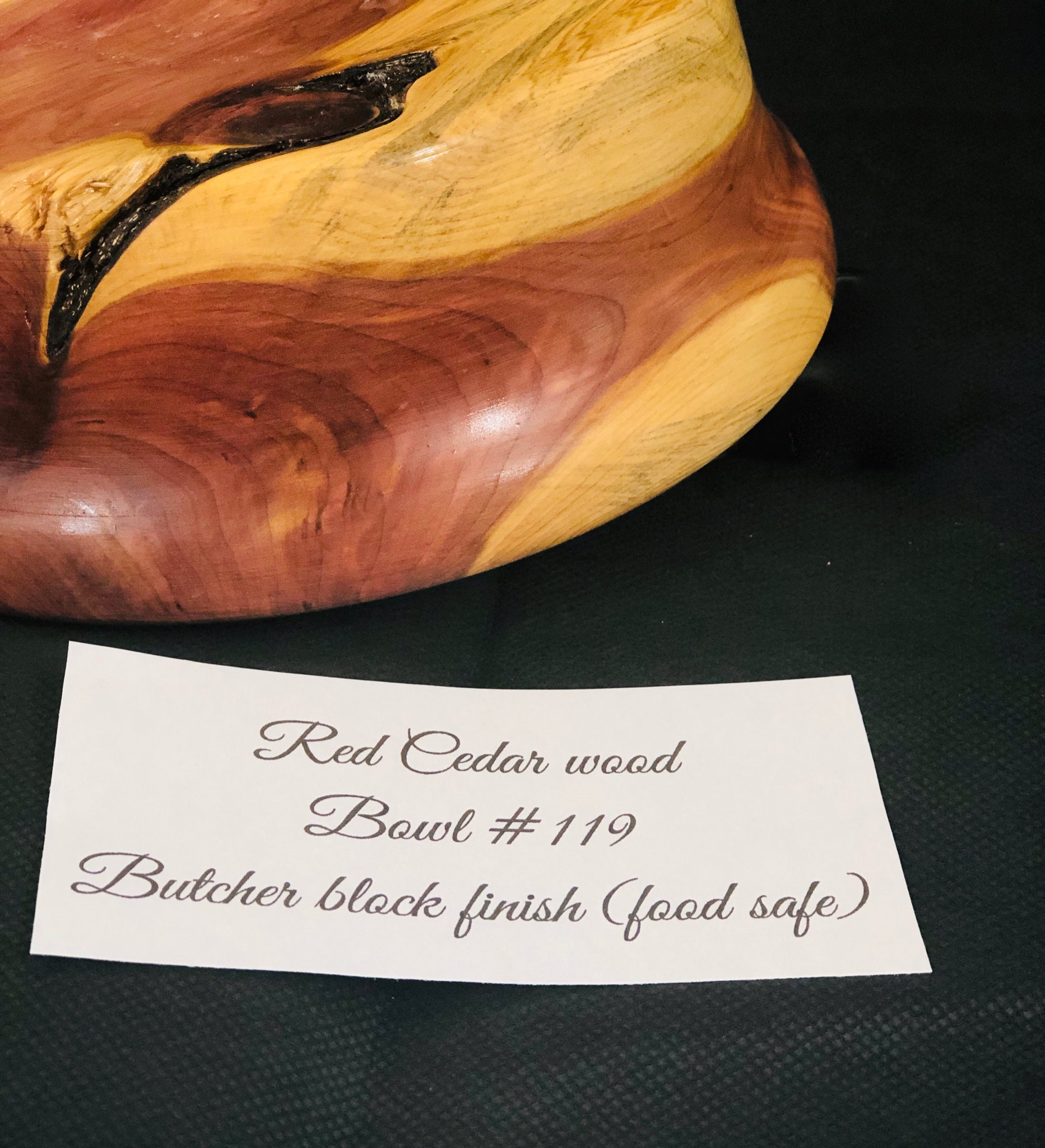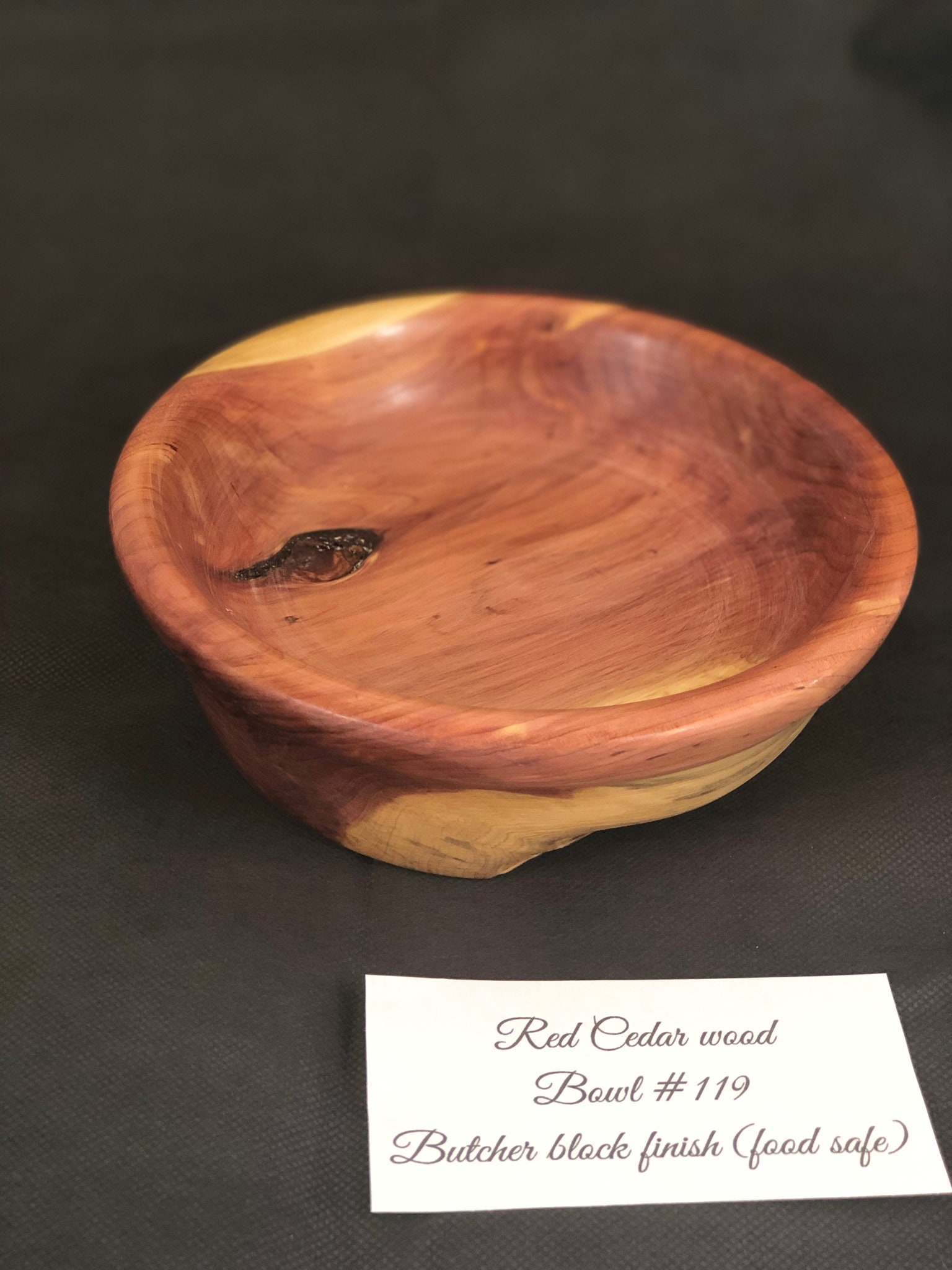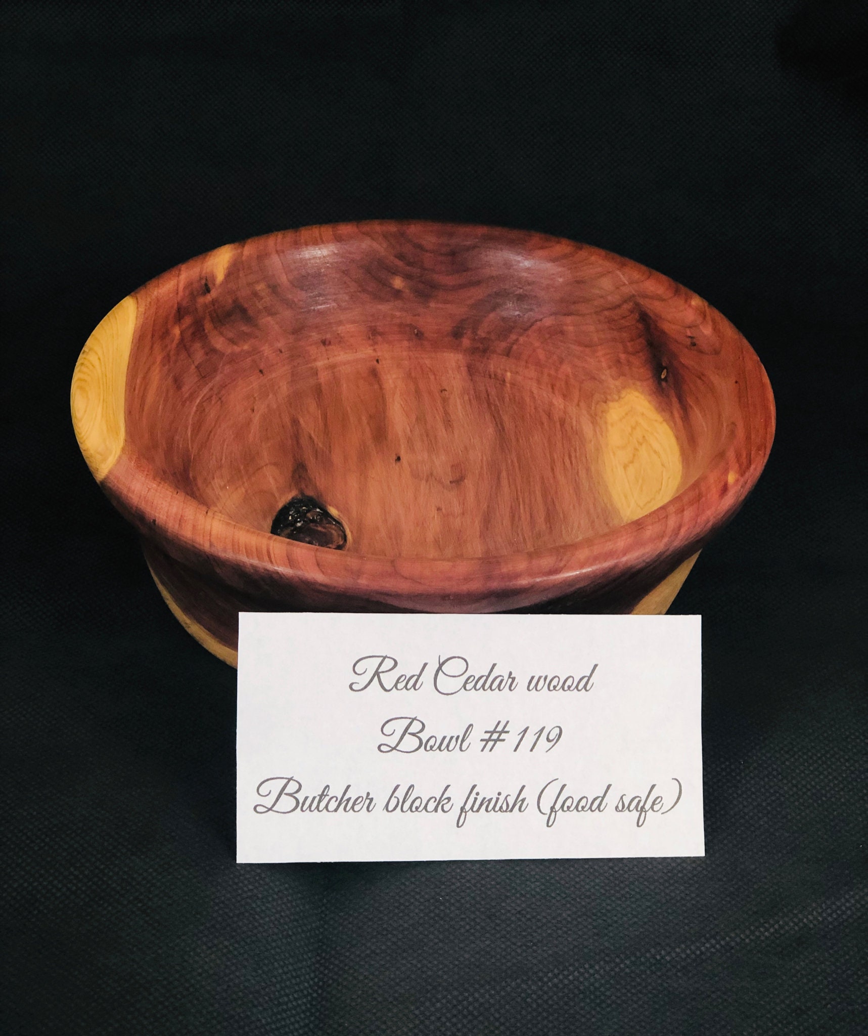 Red cedar bowl with butcher block (food safe) finish. 2.5" tall x 7.75" diameter