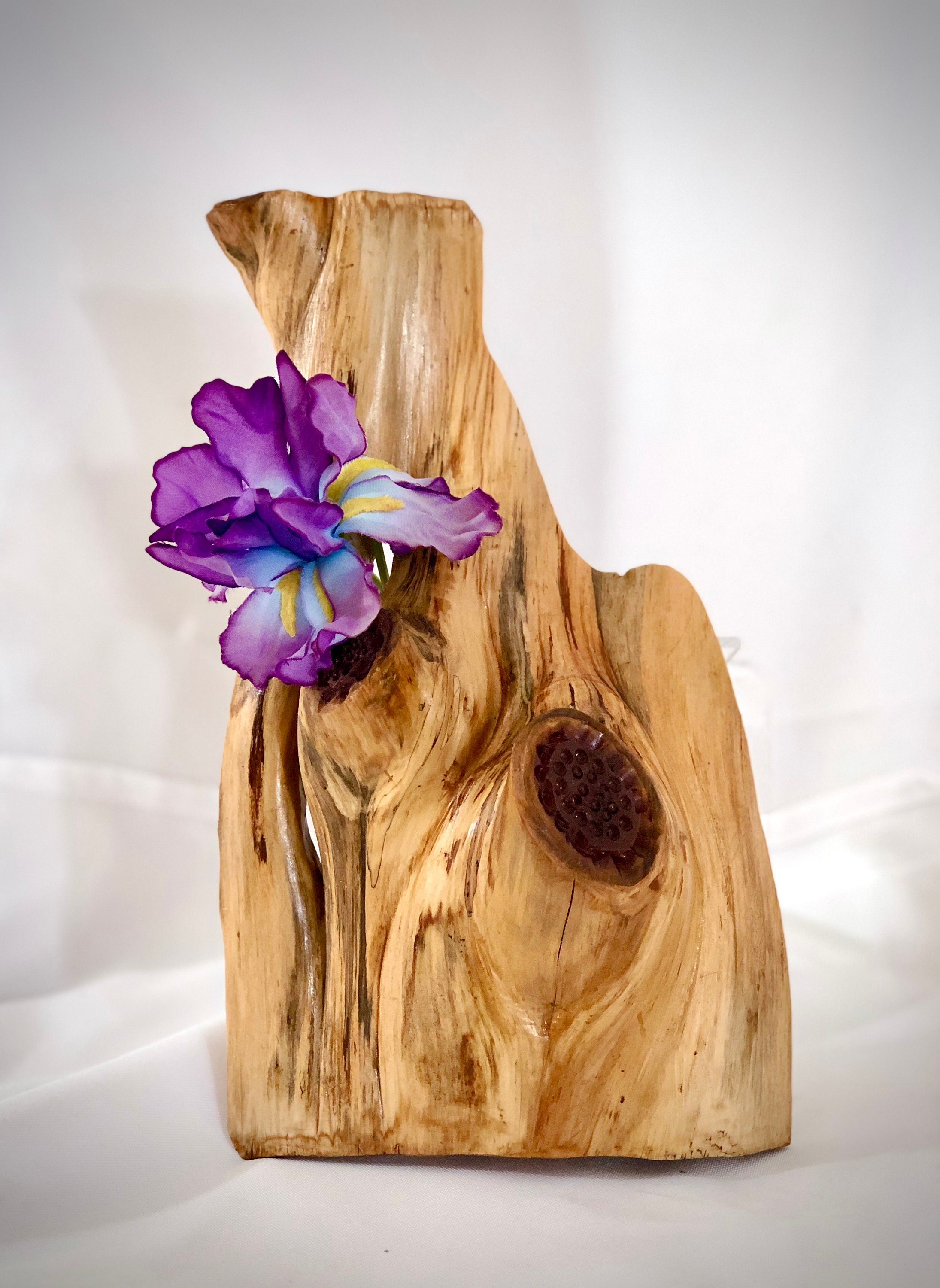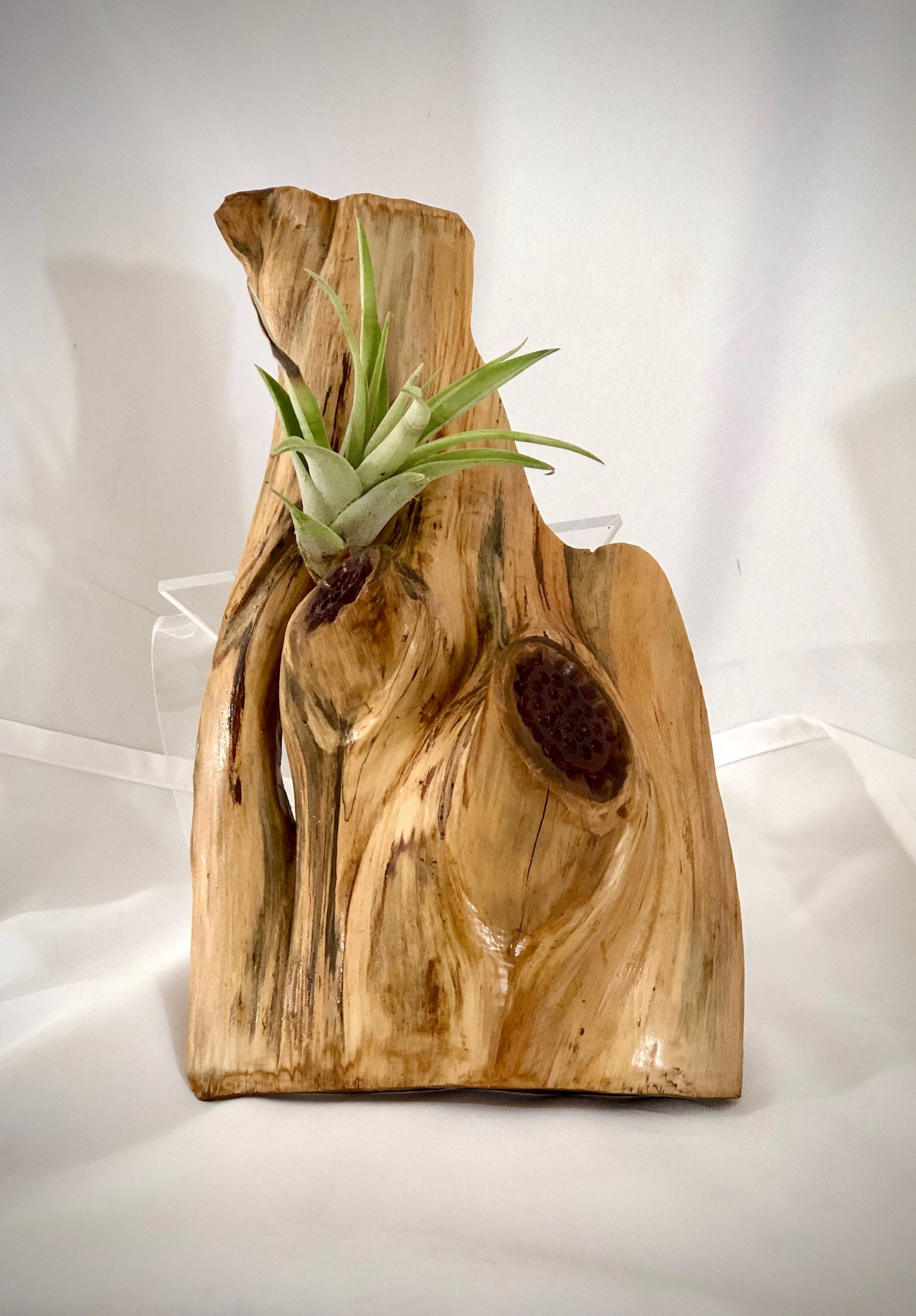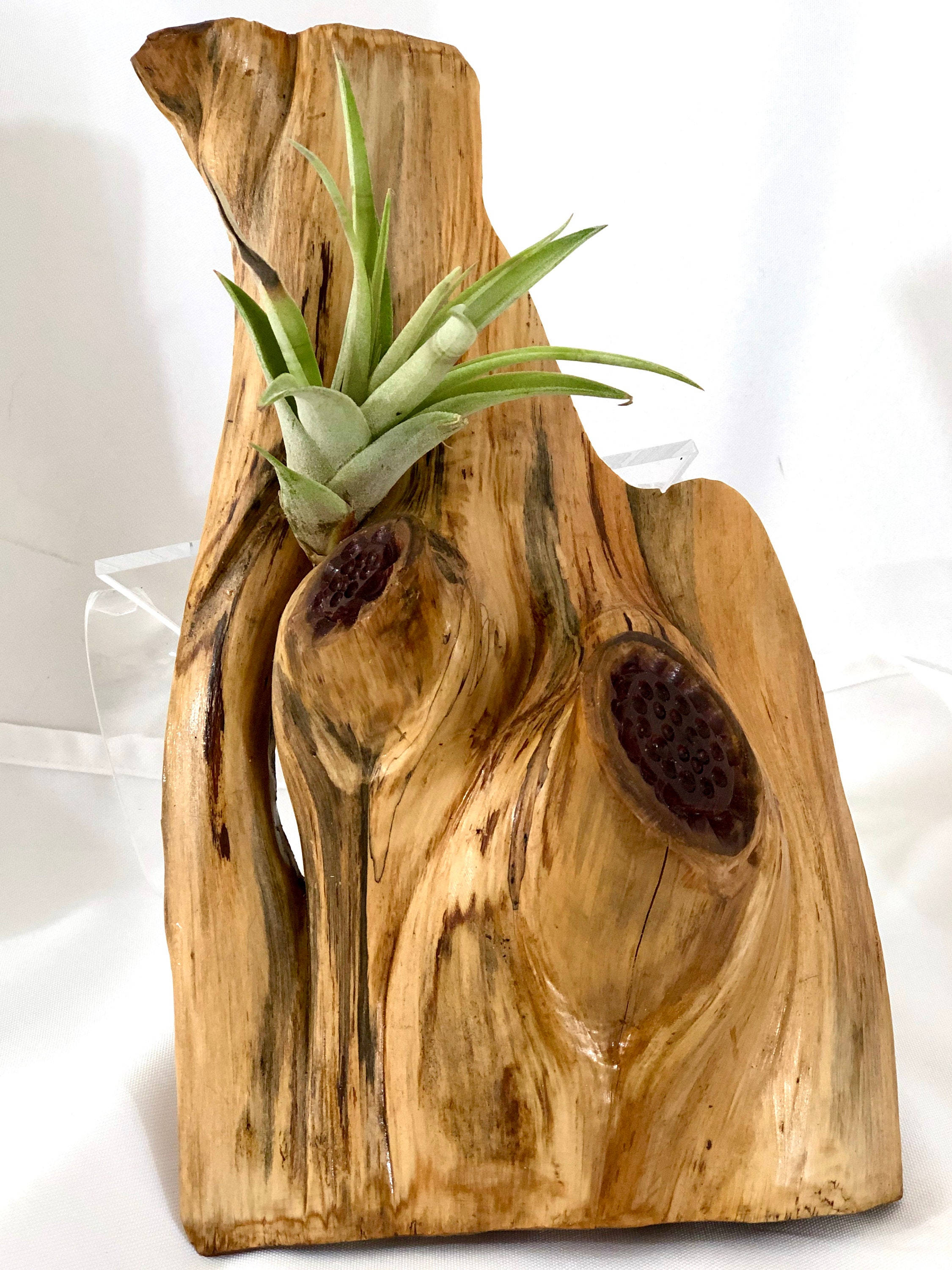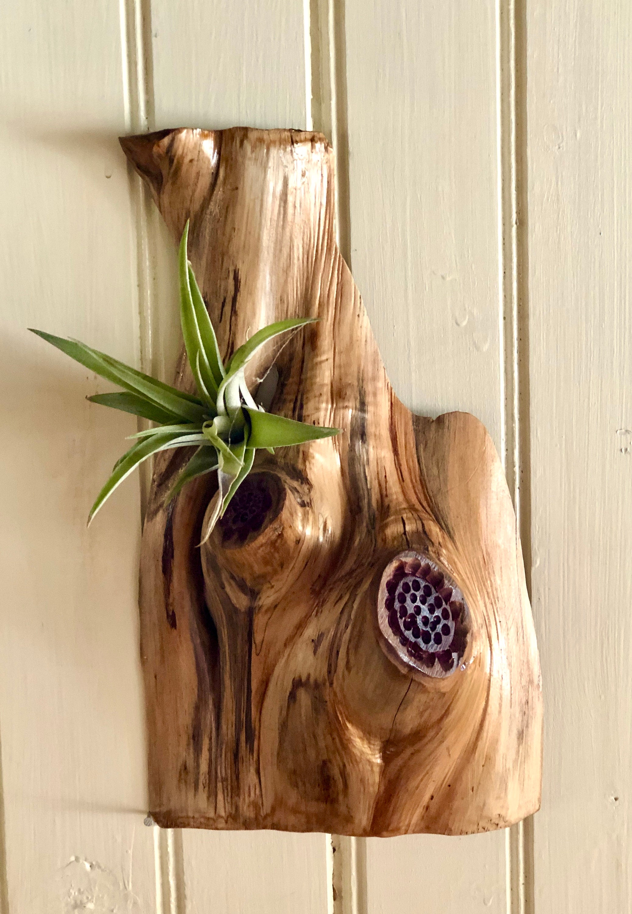This is a red cedar air plant wall hanging with a hanger attached for easy placement. This very unique wall hanger is lightweight and suitable for several types of small air plants or faux succulents. It is sealed with polyurethane for easy care. Choose two or three to arrange on a wall as they are suitable for any room.