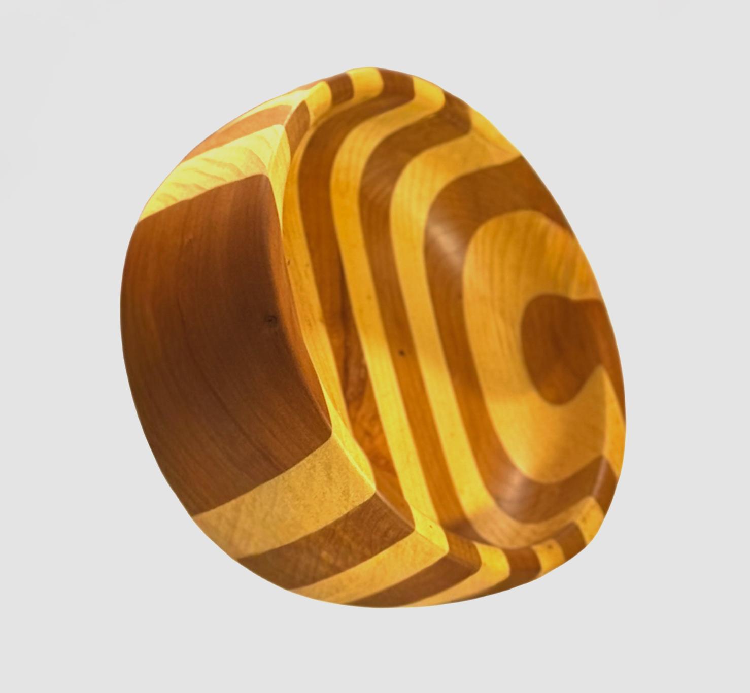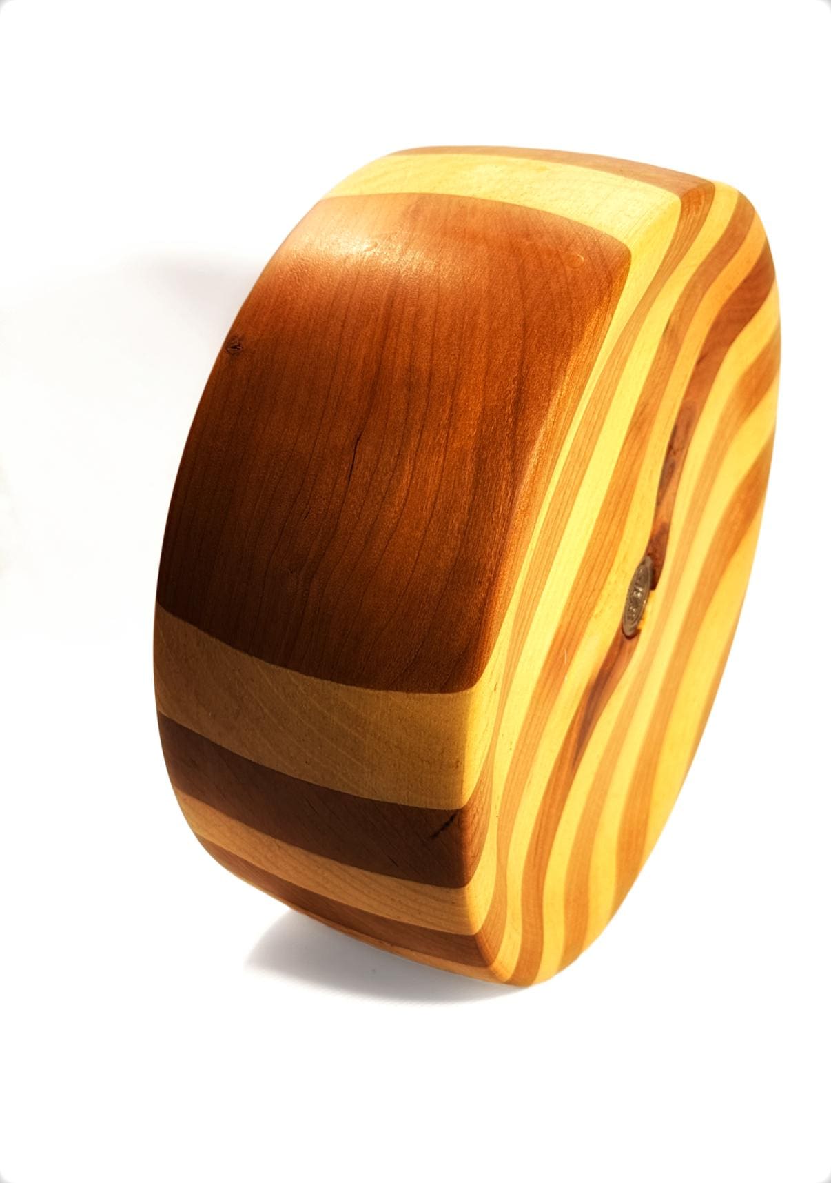 This handcrafted bowl combines the rich warmth of cherry with the soft golden tones of pine, joined together and turned on the lathe to reveal a beautiful striped design. Each layer highlights the natural contrast and harmony between the two woods.